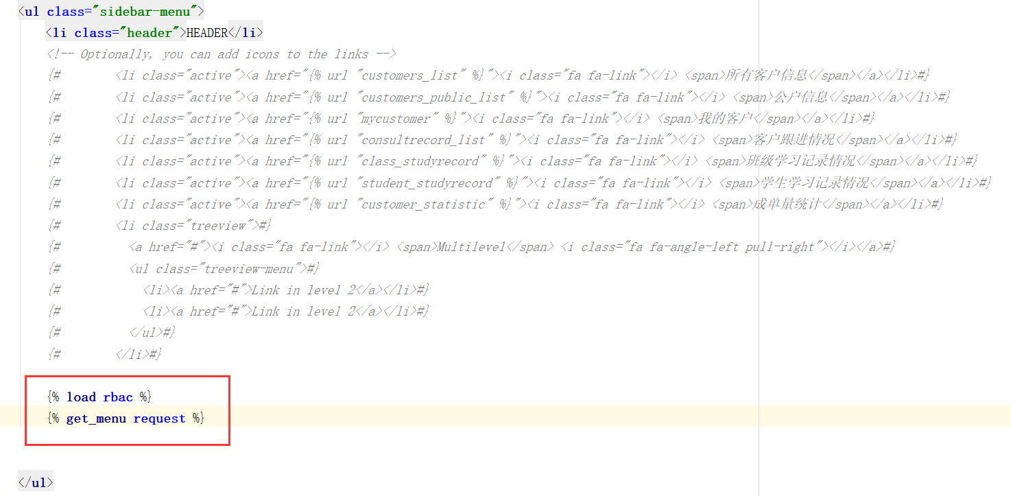 关于该语法调用的是 templatestags / rbac / get_menu(request) 方法,该方法的用处在博文 二级菜单权限 中有详细的解释,该方法会序渲染 menu.html