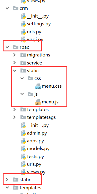 1)在base.html母版中引入,由于css和js在rbac(app)下的静态文件中,这里直接使用static开始即可。