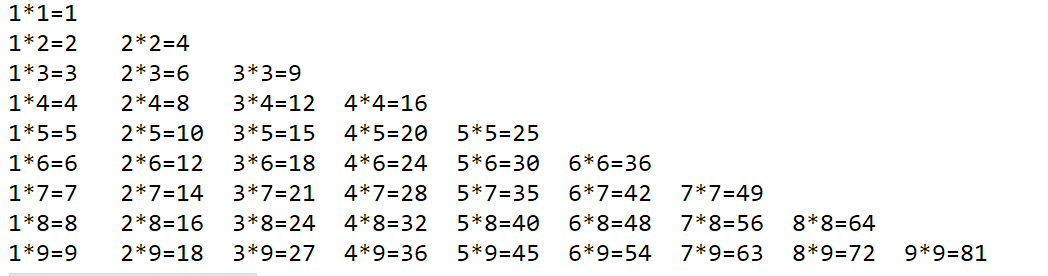 System.out.print(j+"*"+i+"="+i*j+"\t");