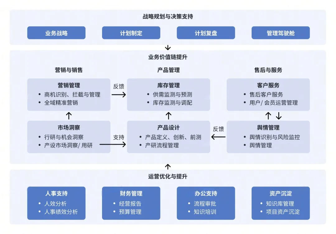 打破数据边界,释放沉睡在数据系统与员工经验中的决策价值。这种将“个体智慧”转为“组织资产”的过程,会使企业不再依赖个别"超级员工",而是形成可迭代升级的集体智能。当企业能汇集员工智慧与业务数据,则更有易于做出优质决策。