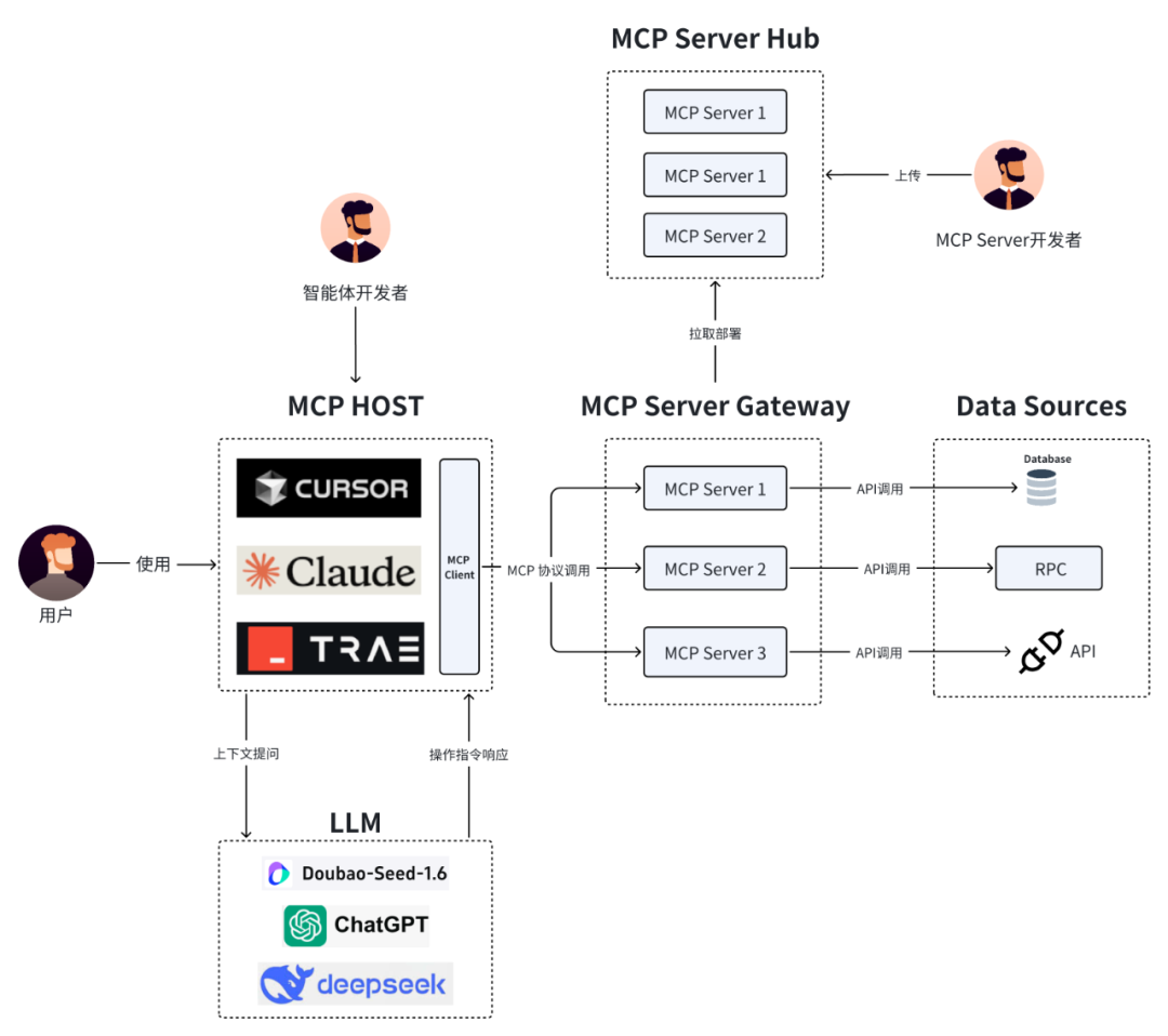 | 组件 | 组件描述 | | --- | --- | | 大型语言模型 (LLM) | 作为核心的智能处理单元,可以是具体的单个模型,也可以是集成了多个模型的平台(如火山方舟) | | MCP 服务端(MCP Server) | 为 MCP Client 提供上下文信息、工具能力及提示词(Prompt)支持。它是外部资源与 AI 模型交互的“执行者”,负责处理具体的工具调用和数据访问任务 | | MCP 客户端(MCP Client) | 作为 MCP Host 的内置通信模块,负责与 MCP Server 建立连接、发送请求并处理响应,是主机端与服务器之间的“通信中介” | | MCP 主机端(MCP Host) | 指大模型应用或智能体,直接处理用户输入,并将任务传递给 LLM。它通过内置的 MCP Client 与外部资源交互,是连接用户与 AI 模型的“核心桥梁” | | MCP 服务端托管平台(MCP Server Hub) | 作为 MCP Server 的集中式托管平台,可理解为各类 MCP Server 的“应用市场”,便于客户端发现和调用所需的服务资源 | | MCP 服务端网关(MCP Server Gateway) | MCP Server 统一对外的网关,用于接受 MCP Client 发送的请求,MCP Server Gateway 可以是单一的 MCP Server,也可以是多 MCP Server | | 数据源(Data Sources) | MCP Server 可访问的外部资源集合,包括本地文件、数据库、Web API 等,是为 AI 模型提供实时或特定领域数据的“信息仓库” |