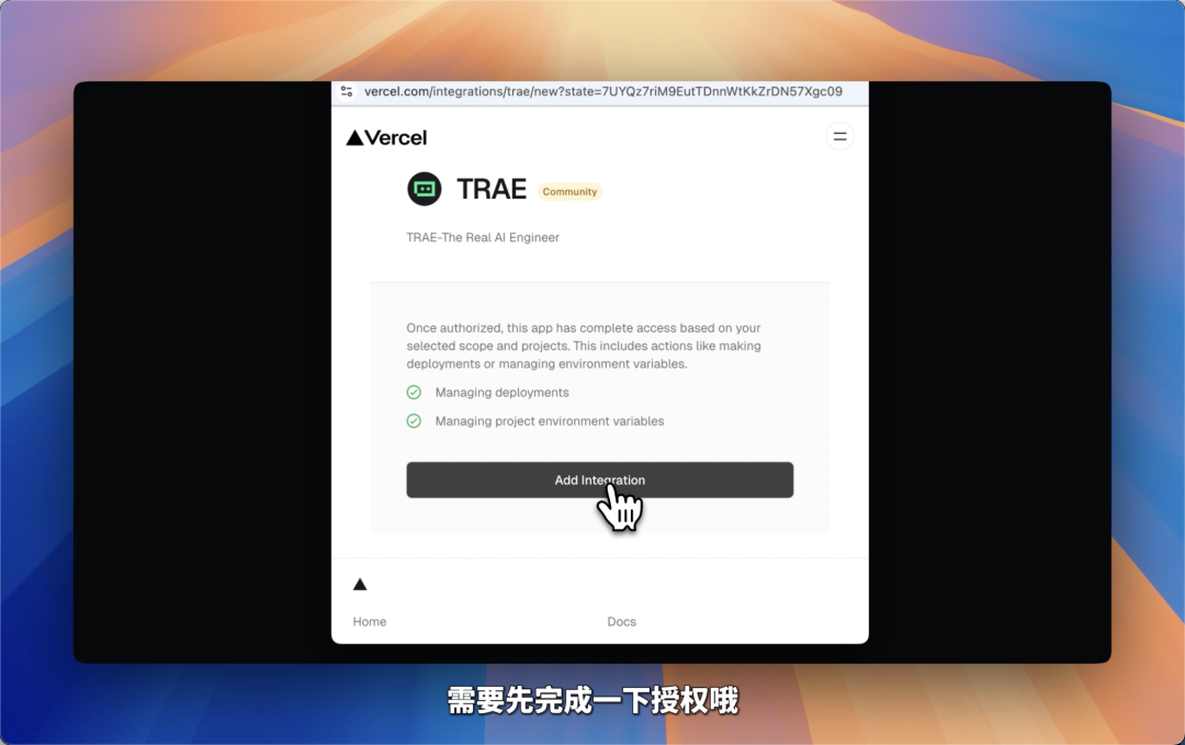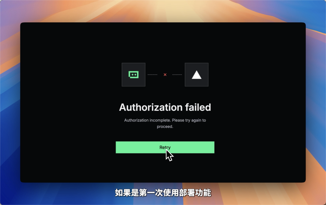 如果是第一次使用部署功能,需要先完成授权,按指引授权 Vercel 账户即可。授权成功后,SOLO 就会接管后续所有的部署工作。