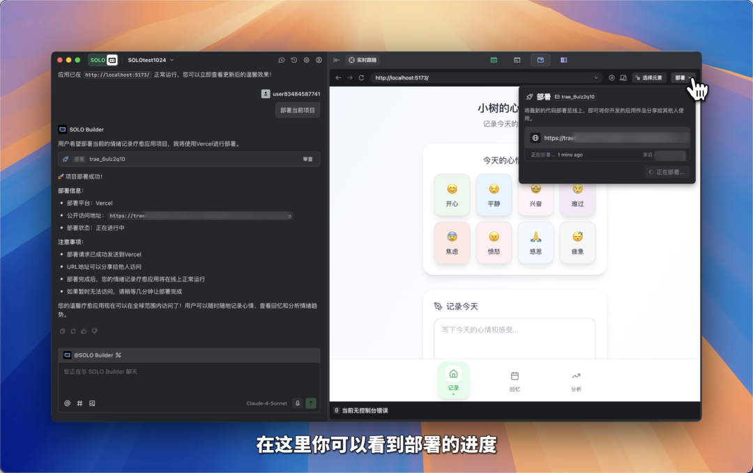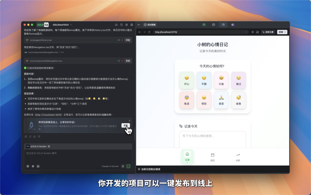 明明代码跑通了,却卡在部署的最后一公里?服务器怎么配?域名怎么绑?依赖冲突怎么解?SOLO 直接帮你省掉繁杂的步骤,写完代码,点击部署,几分钟后就能发链接给朋友。