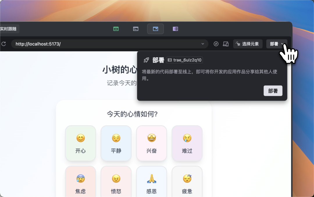 完成开发任务和调试后,最后一步自然是上线部署。在 SOLO 模式下,这个过程同样轻而易举。点击左侧部署卡片 ,或右上角的部署按钮 ,即可开始部署。