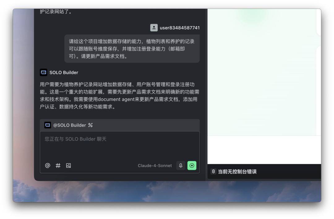 同时,文档支持修改,你可以通过和 SOLO Builder 对话提出修改需求,需求文档和技术架构文档将同步更新。对齐需求后开始开发 ,确保产物和你的想法保持同频。