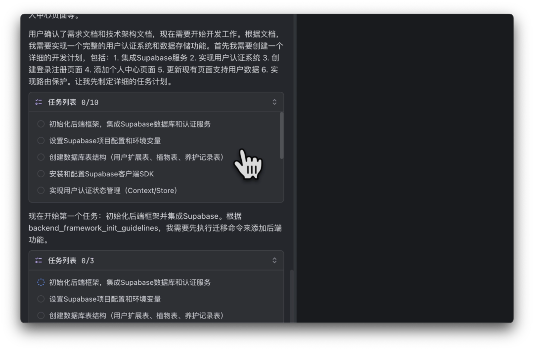 完成架构初始化后,SOLO Builder 将根据需求自动拆分任务步骤 ,梳理任务清单;每完成一个任务会勾选已完成,你能直观看到哪些任务已完成、哪些待处理,清晰掌握任务进度。