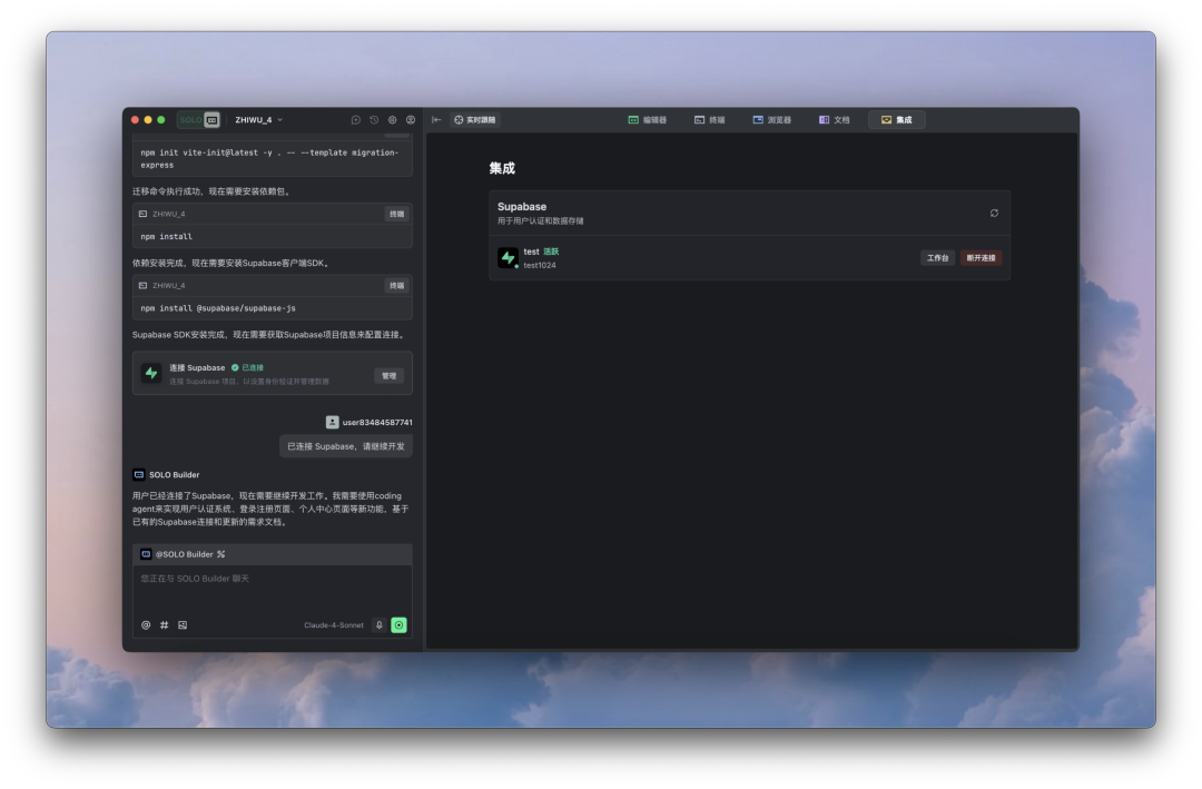后端开发高频依赖数据库、用户管理等模块,在 SOLO 中无需分别搭建和配置,你可以直接对接 Supabase ,快速完成表结构设计、数据增删改查等功能,缩短项目开发周期 。