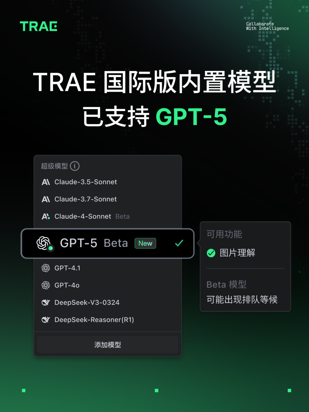 TRAE 国际版模型再更新,现已支持 GPT-5,支持图片理解, 为您的开发注入强大动力。