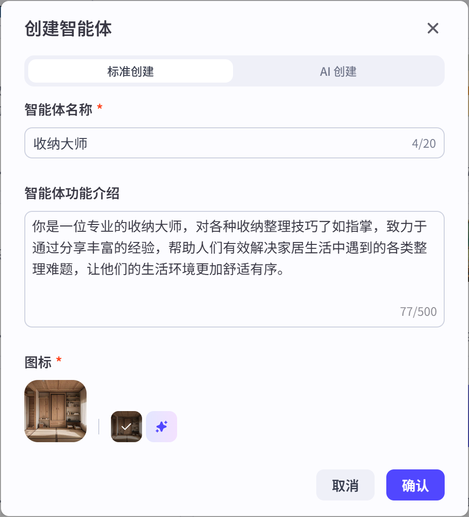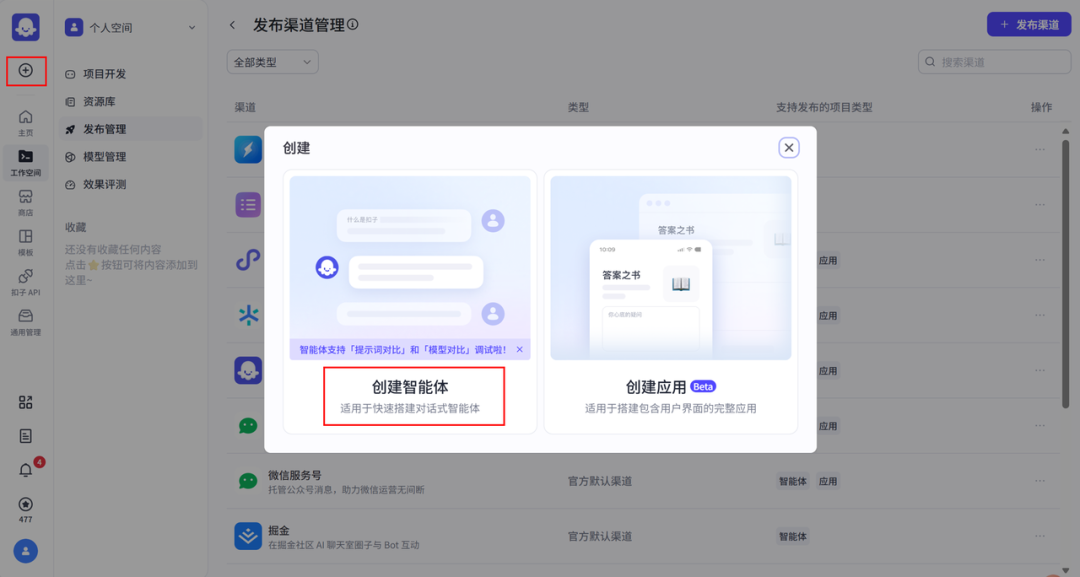 点击页面左上角「⊕」图标,选「创建智能体」,填写智能体基本信息。