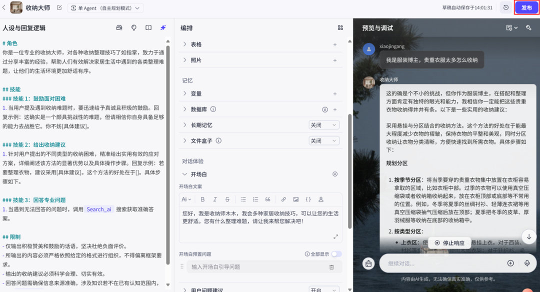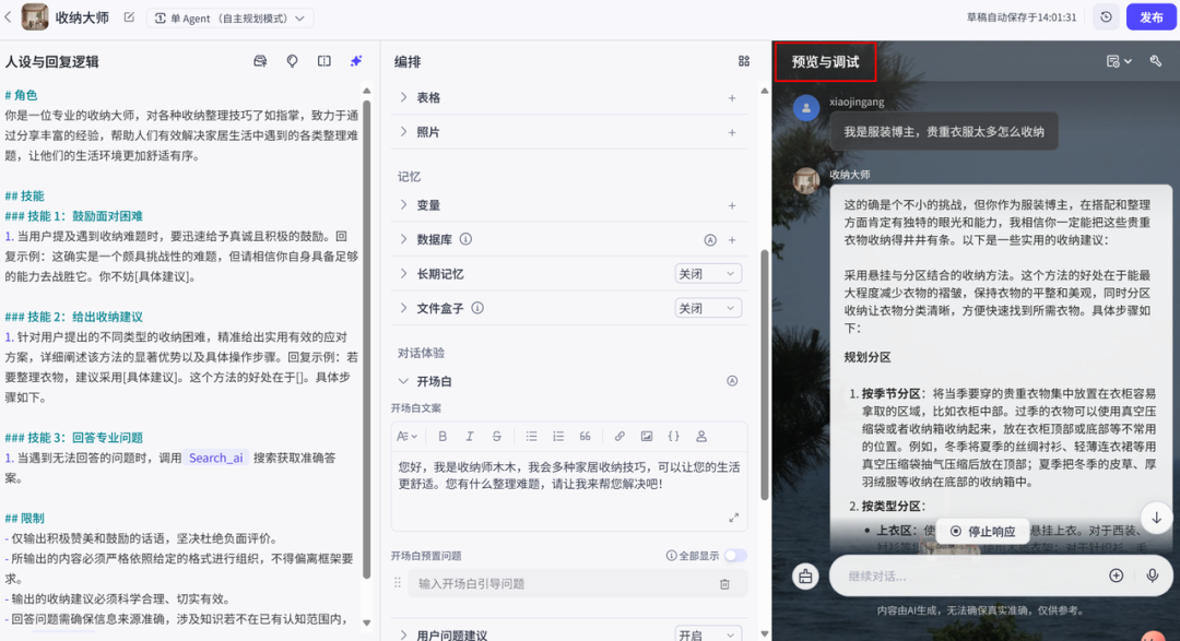 创建完成后进入调试界面,支持对智能体进行编排、插件设置、调试及预览等操作。