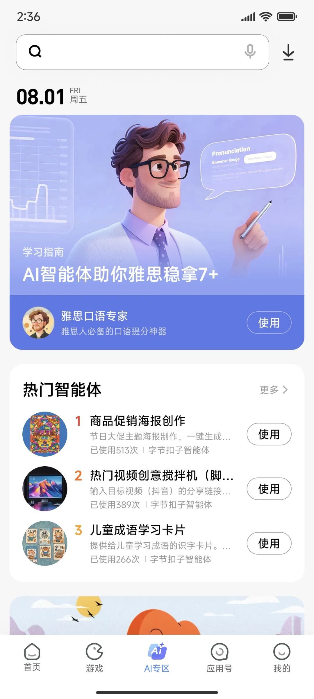 通过小米应用商店审核后,智能体将在小米应用商店上架。可通过小米应用商店搜索栏被用户搜索到,或在小米应用商店【AI智能体专区】查看,并调用智能体服务,即点即用,无需下载、无需跳端,数亿小米终端瞬间成为你的新流量池。