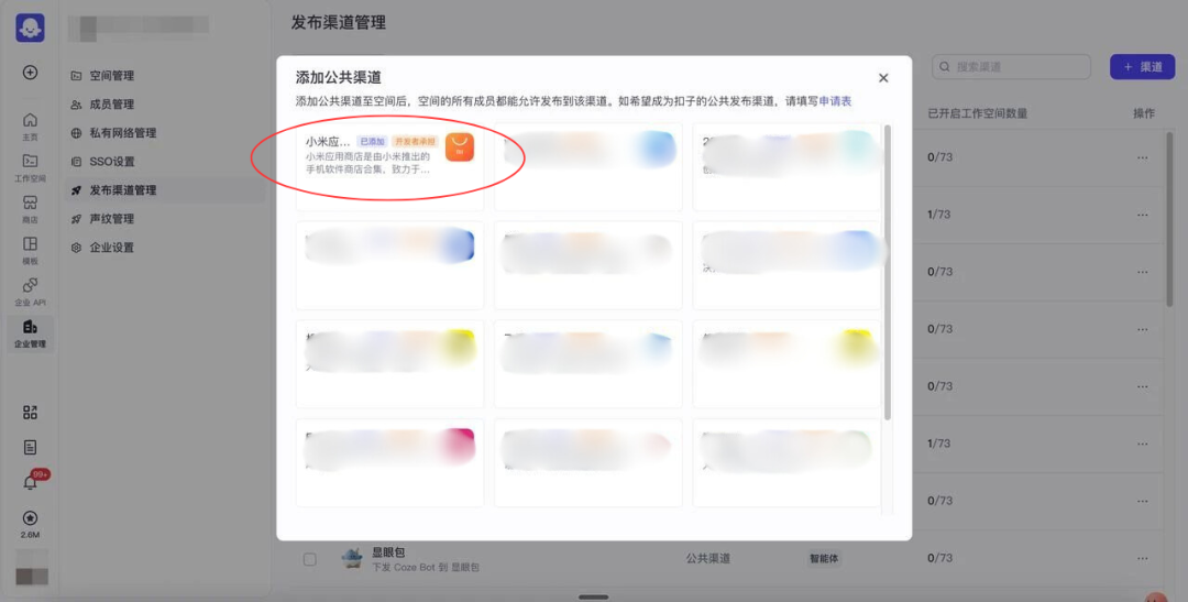 进入「工作空间」中的「发布管理」,选择右上角「+发布渠道」中的「公共渠道」,将小米应用商店 添加至空间。