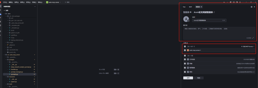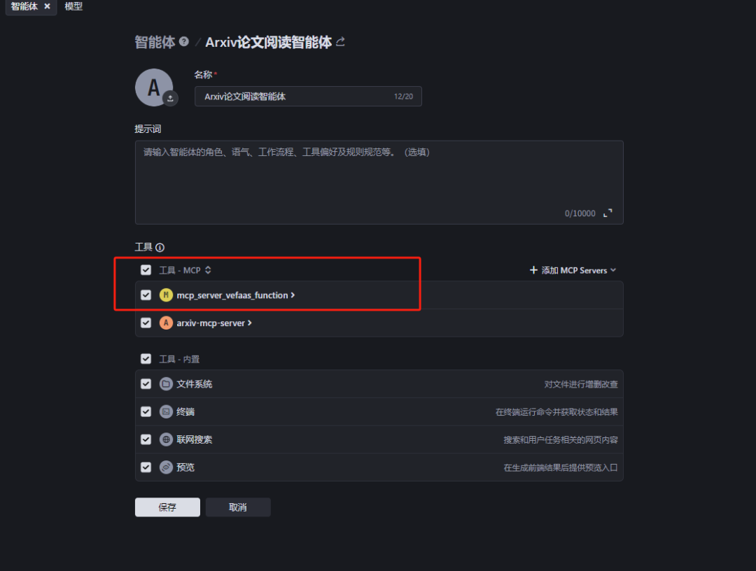 在构建好Paper Reading 的MCP之后,我们可以继续配置智能体,将构建好的MCP集成到智能体对话能力中