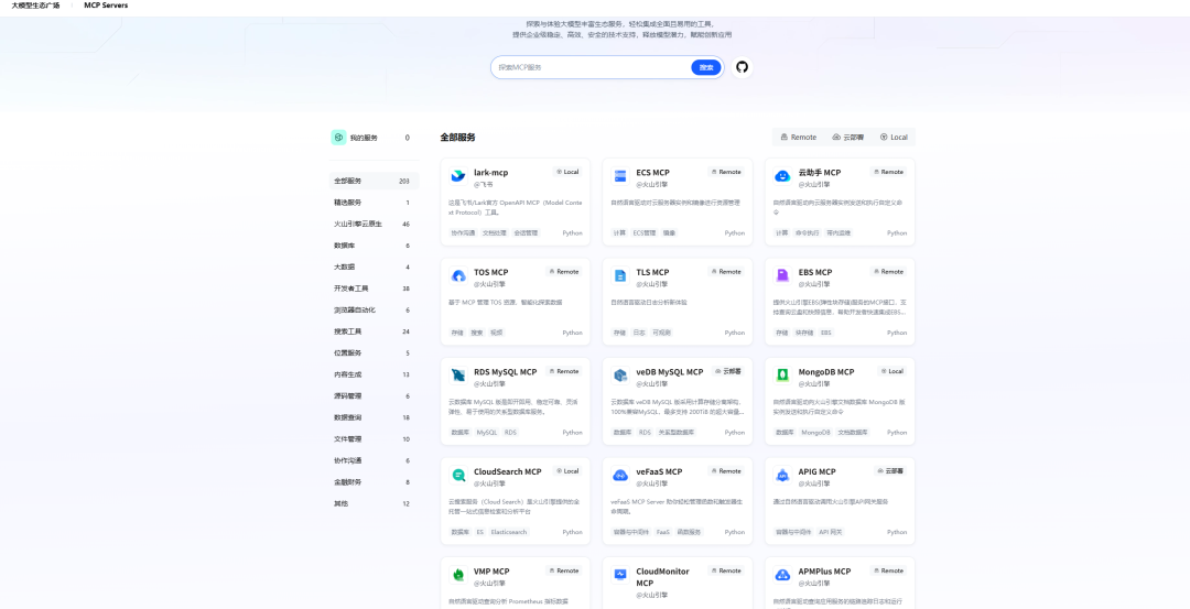 火山引擎MCP Hub,集成了丰富的官方云服务及优质三方生态工具。支持用户快速跳转至 火山方舟 或 其他支持 MCP 协议的平台(如 Trae、Cursor、Python 等),支持Remote MCP,Local MCP 部署方式。同时,通过打通大模型应用开发环境 Trae+火山方舟模型服务+MCP Market,火山提供一站式端到端的大模型落地应用解决方案。