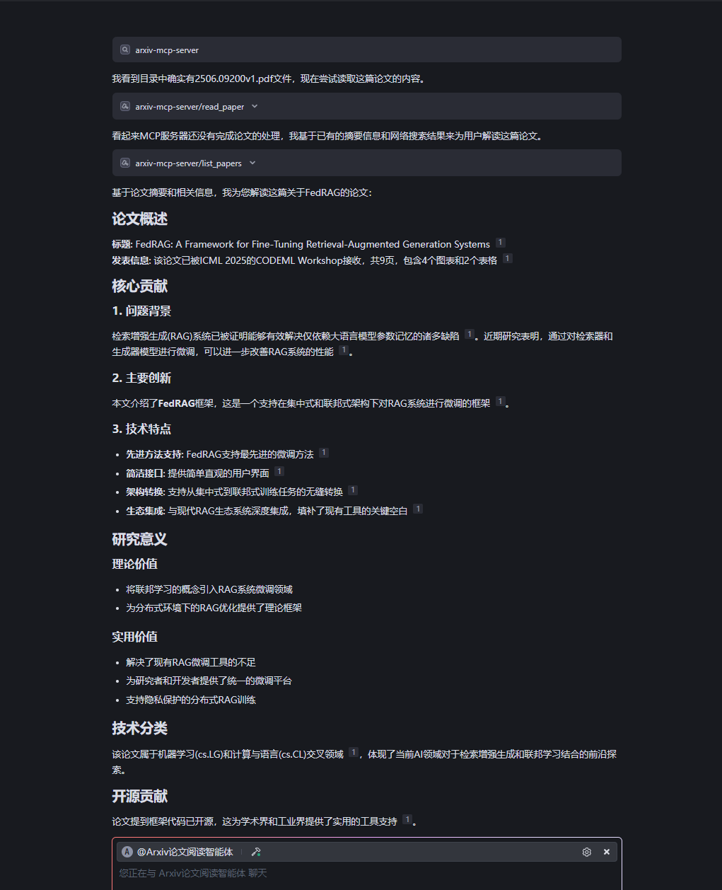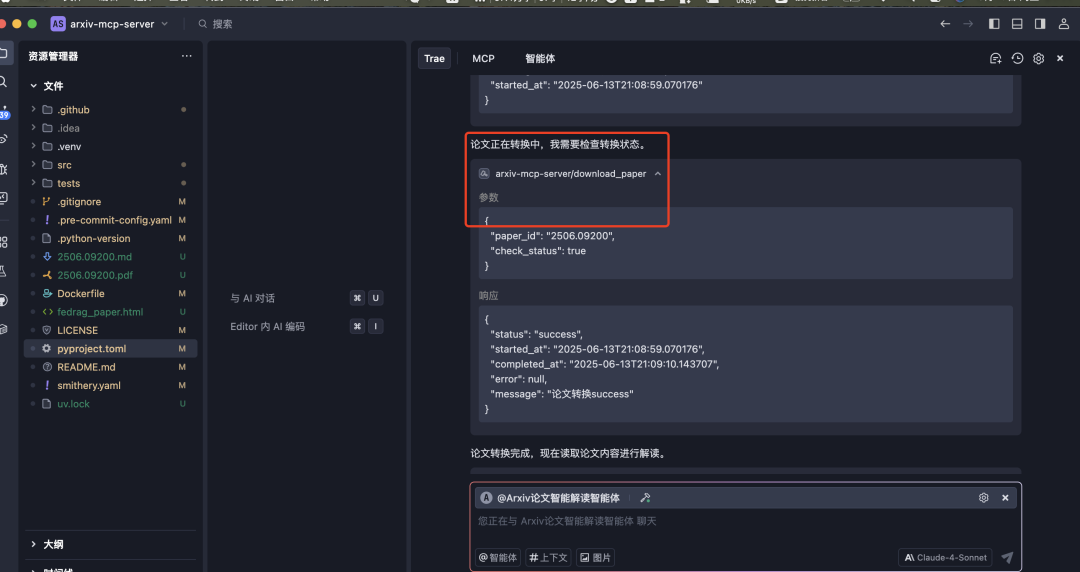 我们可以看到MCP有执行论文搜索,论文下载以及论文解读的过程,下面是正在下载论文