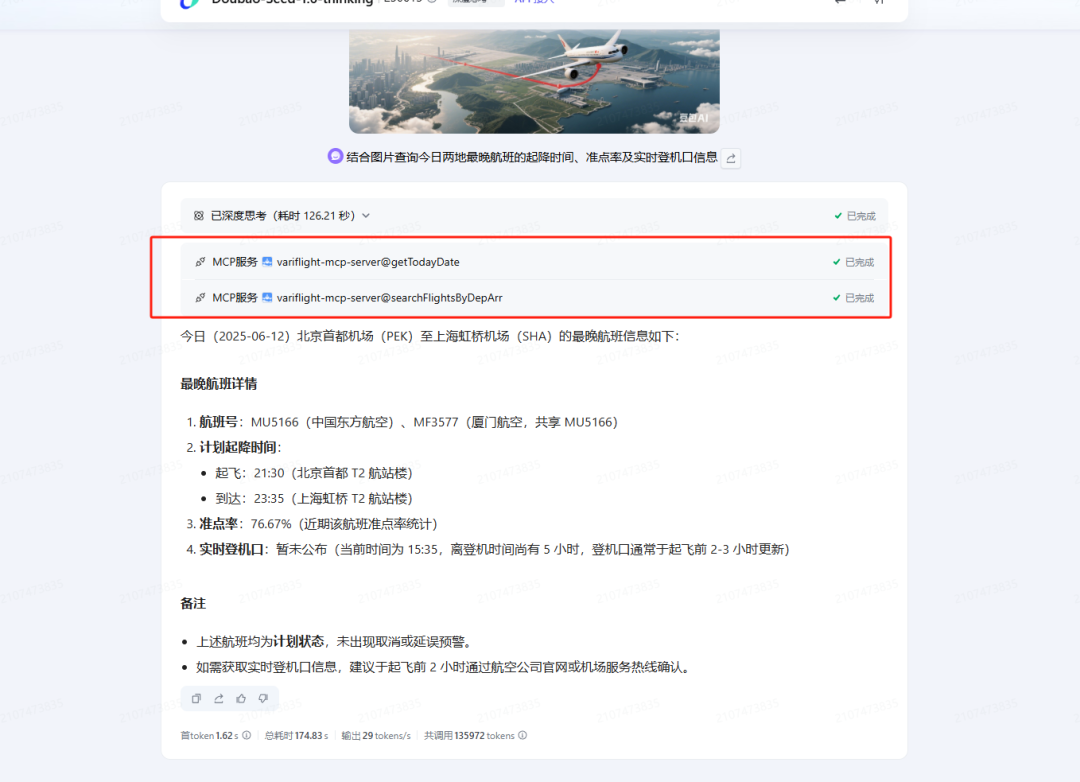 比如我们这里开启了飞常准的MCP,我们测试下效果