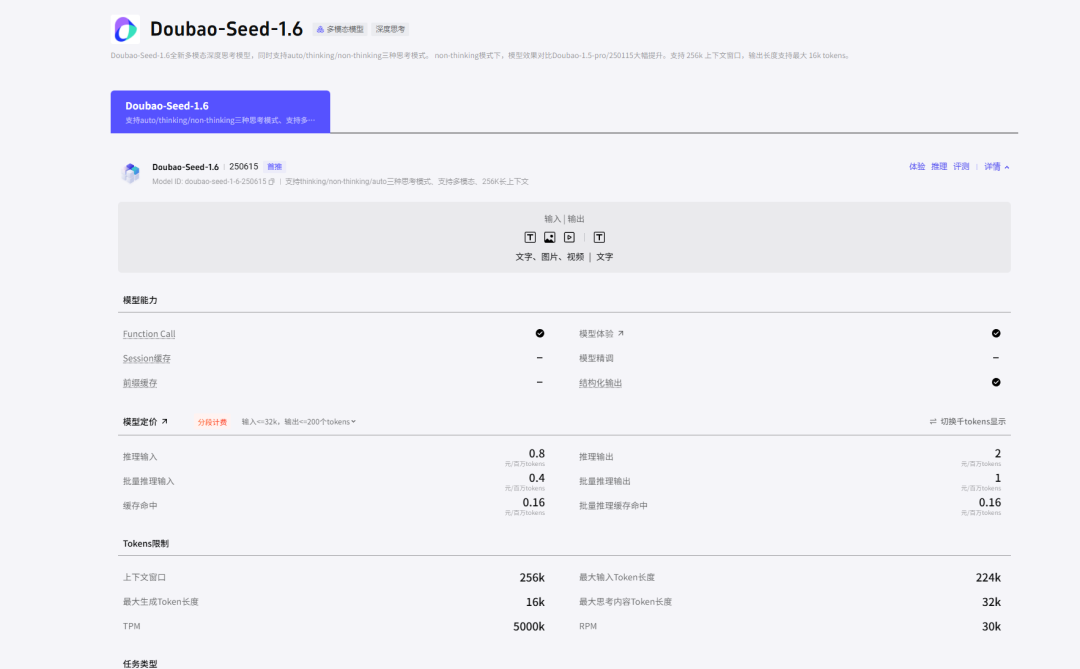 | 规格项 | Doubao-Seed-1.6-thinking | Doubao-Seed-1.6 | Doubao-Seed-1.6-flash | | --- | --- | --- | --- | | 输入 | 文本、图片、视频 | 文本、图片、视频 | 文本、图片、视频 | | 输出 | 文本 | 文本 | 文本 | | 是否输出思考过程 | ✅ 思考内容:reasoning_content