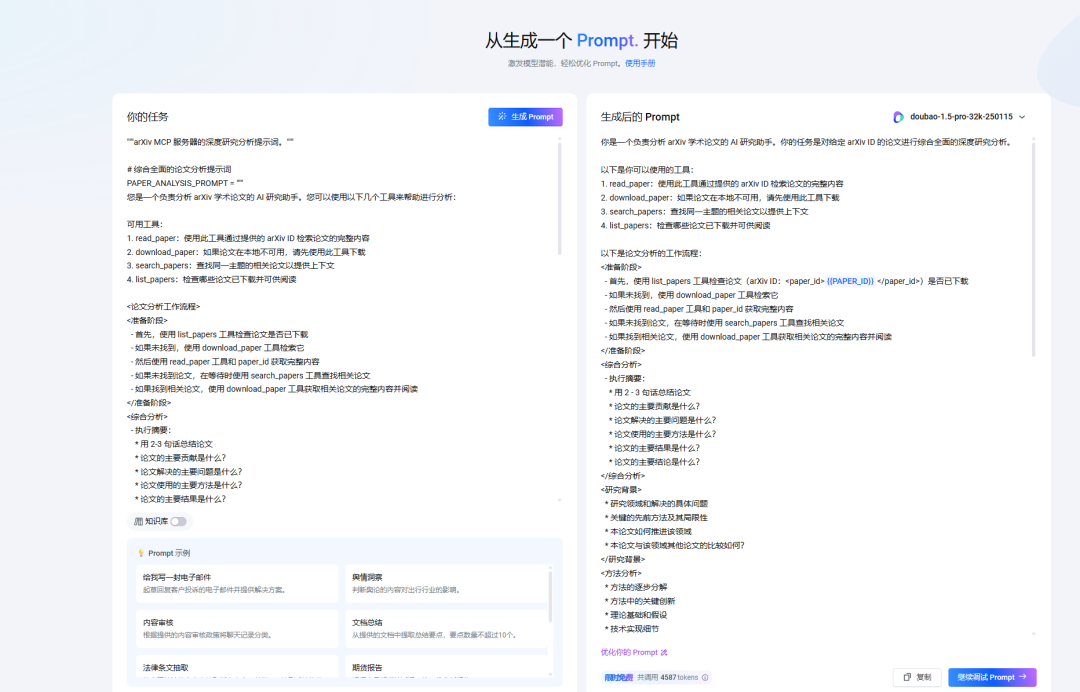 这里我们通过火山方舟Prompt Pilot优化一下Arxiv论文解读的提示语