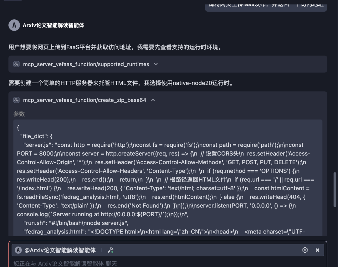 我们通过添加veFaaS mcp,将论文解读内容部署发布成一个网页