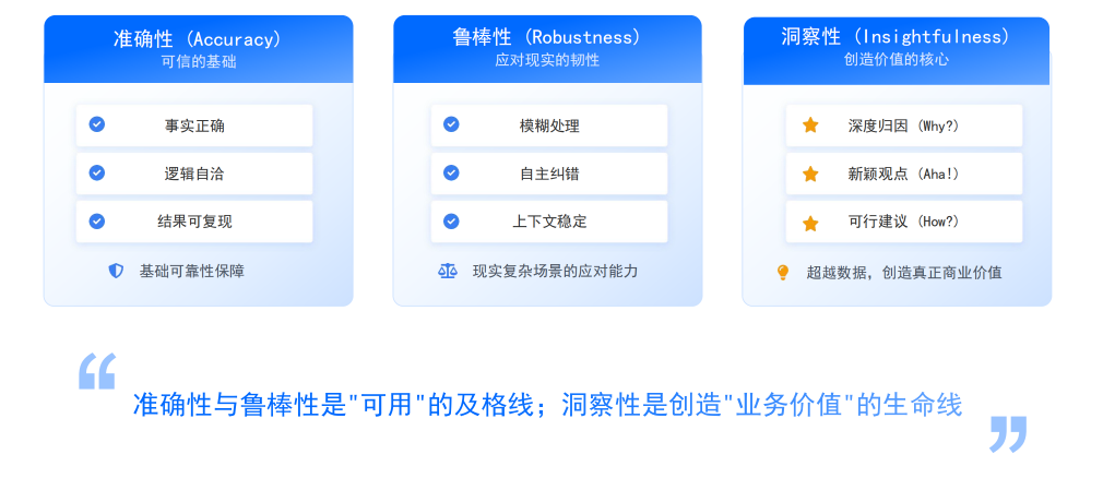 评估Data Agent的效果涉及多个维度,包括准确性、鲁棒性以及洞察性。传统的BI工具关注速度、准确性和易读性,而Deep Research则在此基础上增加了对洞察性的考量: