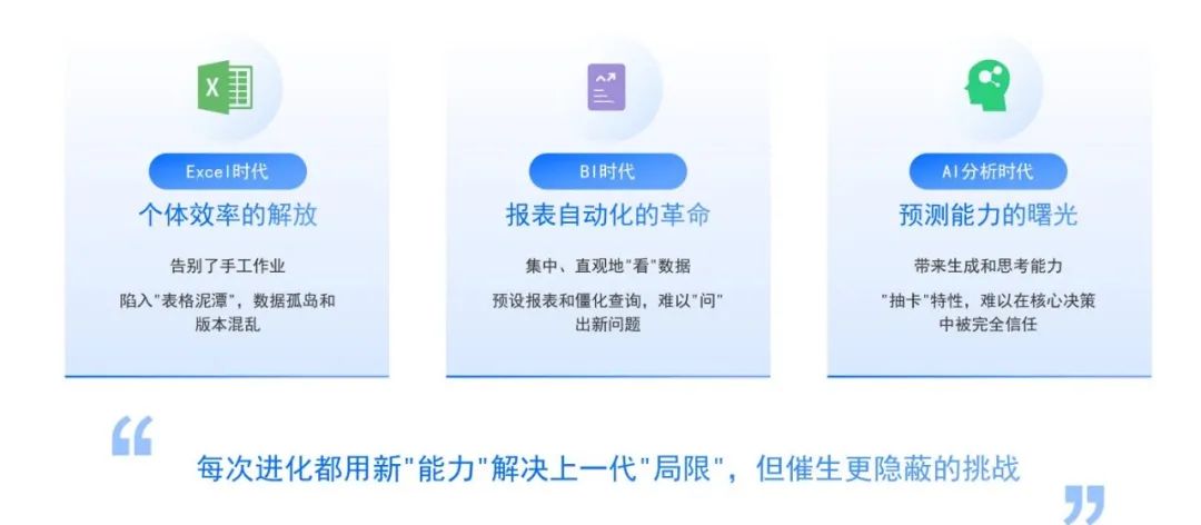 工具迭代从 Excel 到 BI 再到 AI,始终遵循"解决旧问题、产生新挑战"的叠加优化规律。