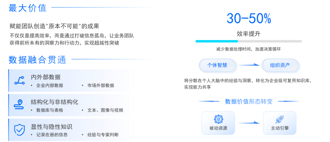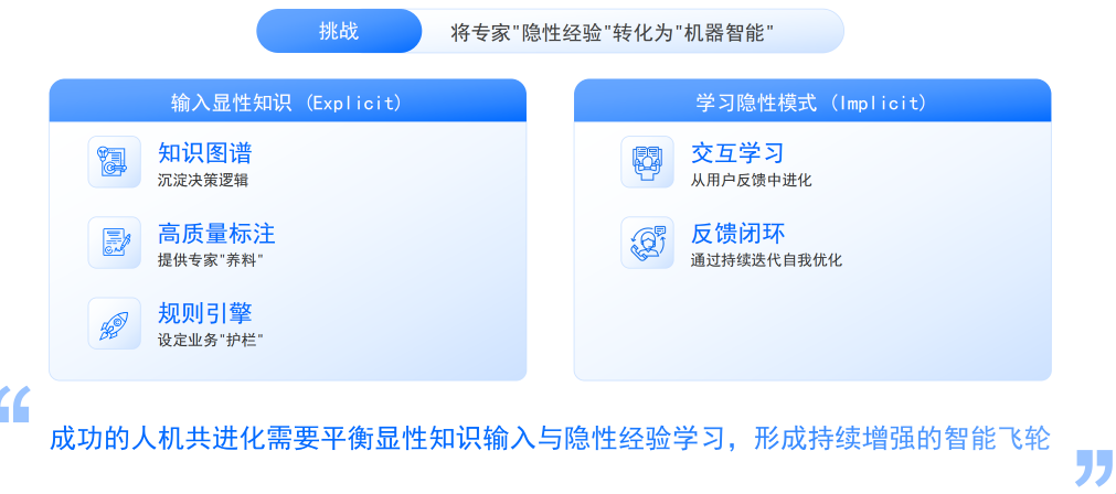 隐性知识沉淀:用户提问、反馈、点赞、追问等行为中蕴含大量有价值的“隐性知识”。例如,用户对某份报告的认可可以转化为训练数据,进而优化后续问答质量。这种自动化的“飞轮”机制虽具潜力,但仍面临模型泛化能力不足、反馈信号稀疏等问题。