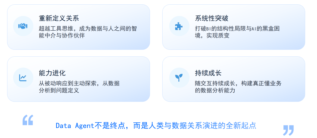 Data Agent并非万能工具,也不是对传统BI和分析师角色的替代者,而是一种面向“启发性思考”、“探索性分析”和“智能辅助决策”的新形态。