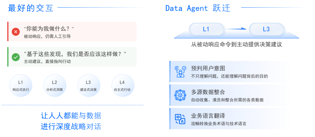 Data Agent超越了传统的工具思维,它不再仅仅是一个被动的数据分析工具,而是成为数据与人之间的智能中介与协作伙伴。