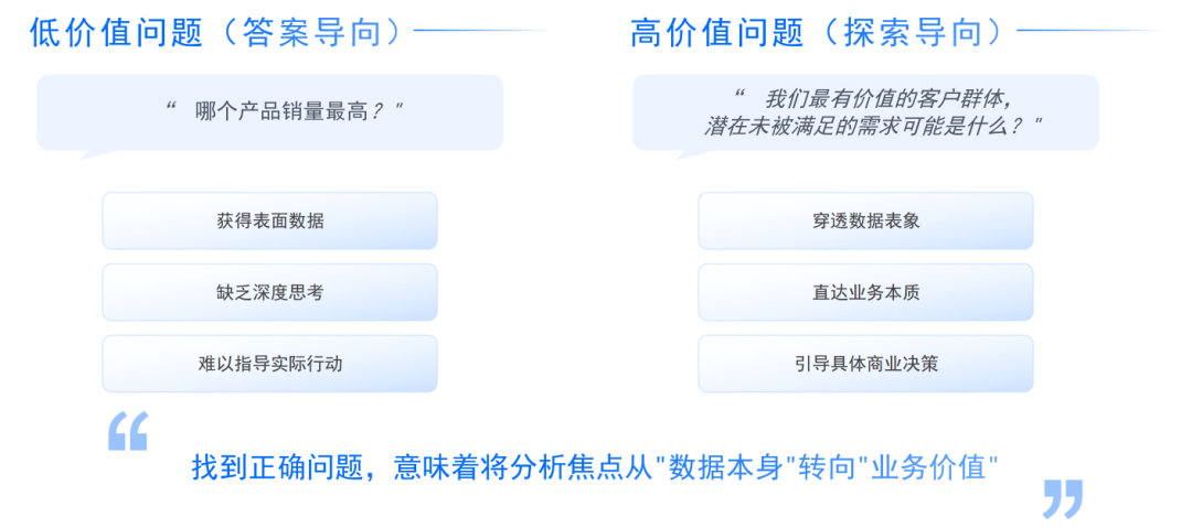 用户在查看数据时,不仅仅关注数据本身(如销售额的数值),更关注数据背后的原因(如销售额上升或下降的原因)以及后续的行动方案(如接下来该如何应对)。这才是用户真正关心的问题。