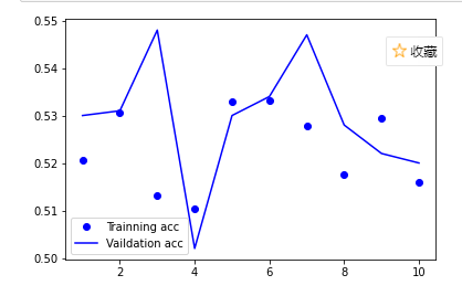 plt.plot(epochs, val_acc, 'b', label='Vaildation acc') # 以epochs为横坐标,以验证集准确性为纵坐标