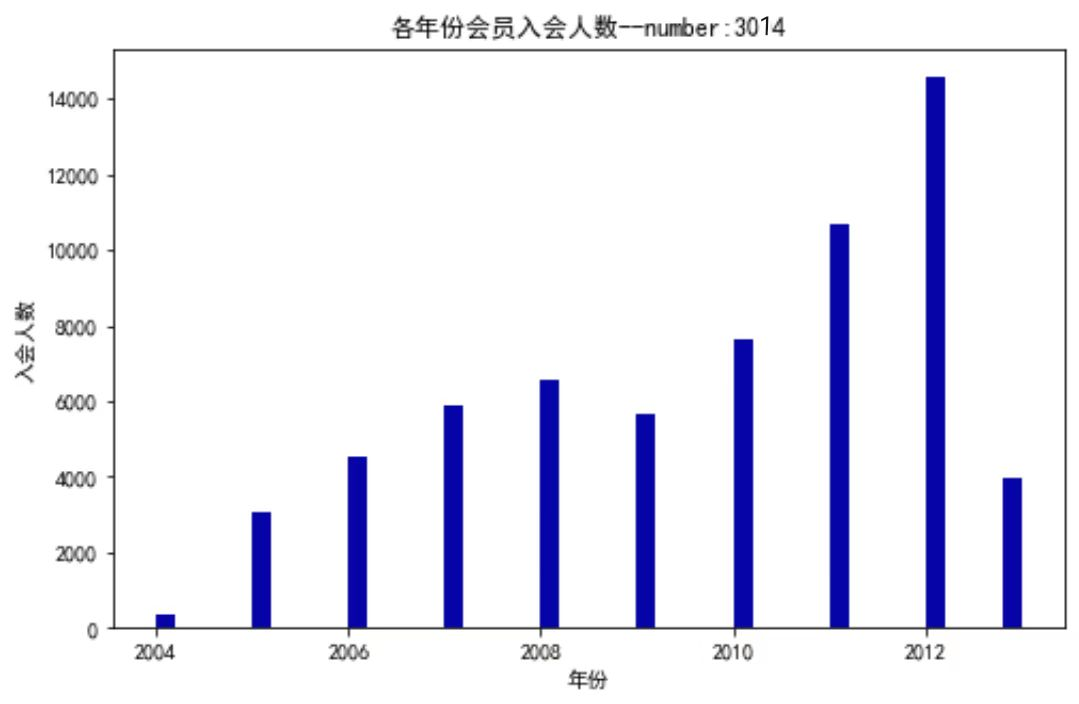 # 绘制各年份会员入会人数直方图