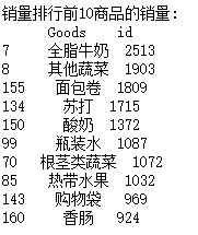 print('销量排行前10商品的销量:\n', sorted[:10]) # 排序并查看前10位热销商品
