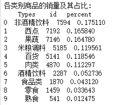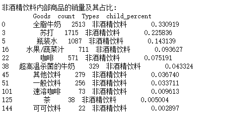 print('非酒精饮料内部商品的销量及其占比:\n',selected)
