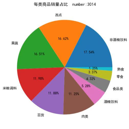 plt.title('每类商品销量占比 number:3014') # 设置标题