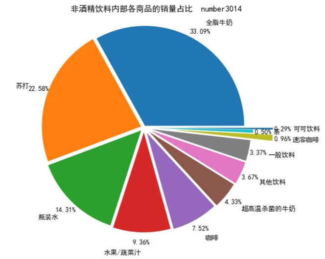 plt.title("非酒精饮料内部各商品的销量占比 number:3014") # 设置标题