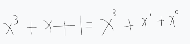 可知最多3次方,那么对应的除数位是(3+1)=4位,从多项式可知,4位的数字中,0,1,3都是1(看上面式子的平方次数,从0开始数,从右到左数),因此得出除数是 1011