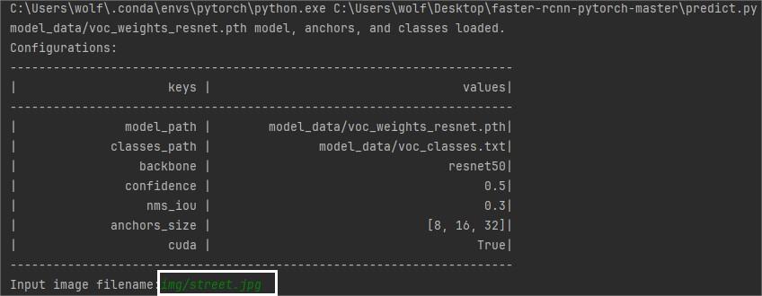 5.下载完库后解压,在百度网盘下载frcnn_weights.pth,放入model_data,运行predict.py,输入img/street.jpg后点击enter键即可
