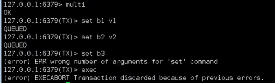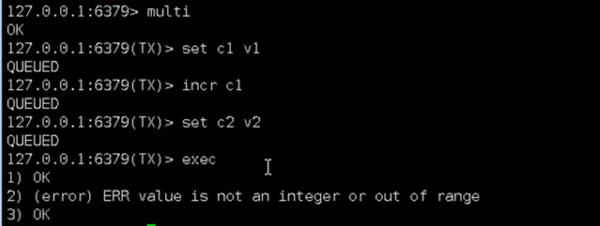 事务中如果有一条命令执行失败,其后的命令仍然会被执行,没有回滚