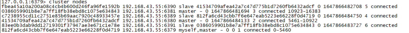 redis-cli --cluster create --cluster-replicas 1 192.168.43.55:6379 192.168.43.55:6380 192.168.43.55:6381 192.168.43.55:6389 192.168.43.55:6390 192.168.43.55:6391