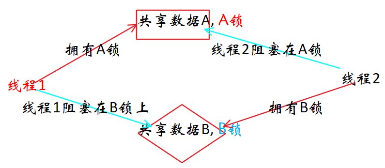 线程1访问共享资源B,会阻塞在B锁上