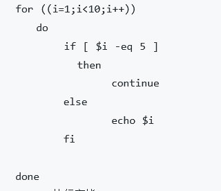 continue用于跳过某次循环,继续执行下次循环,如下,当i为5时跳过,执行下次循环。