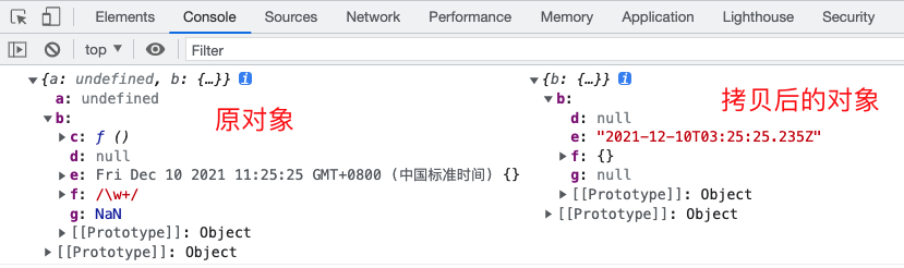 //使用递归实现深拷贝 function clone(obj) { //判断拷贝的obj是对象还是数组 var objClone = Array.isArray(obj) ? [] : {}; if (obj && typeof obj === "object") { //obj不能为空,并且是对象或者是数组 因为null也是object for (key in obj) { if (obj.hasOwnProperty(key)) { if (obj[key] && typeof obj[key] === "object") { //obj里面属性值不为空并且还是对象,进行深度拷贝 objClone[key] = clone(obj[key]); //递归进行深度的拷贝 } else { objClone[key] = obj[key]; //直接拷贝 } } } } return objClone; }