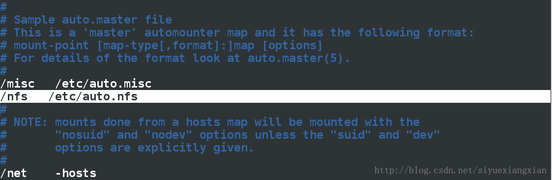 如上所示,挂载点在/nfs下,而/etc/auto.nfs则描述了挂载动作。(这是一个自定义文件,默认由auto.master引用的文件称作auto.misc)