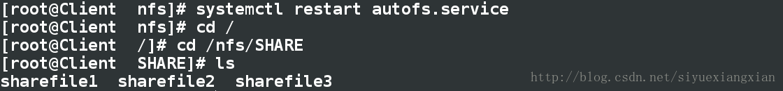 重启autofs服务。这样,远程服务器下的/share便被自动挂载到客户端/nfs/SHARE下了。