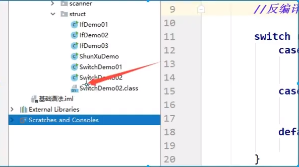 将class文件拖到Java文件夹中,此时IDEA中就出现class文件,其中 SwitchDemo02.class 前面的图标上“01”表示此为源码文件