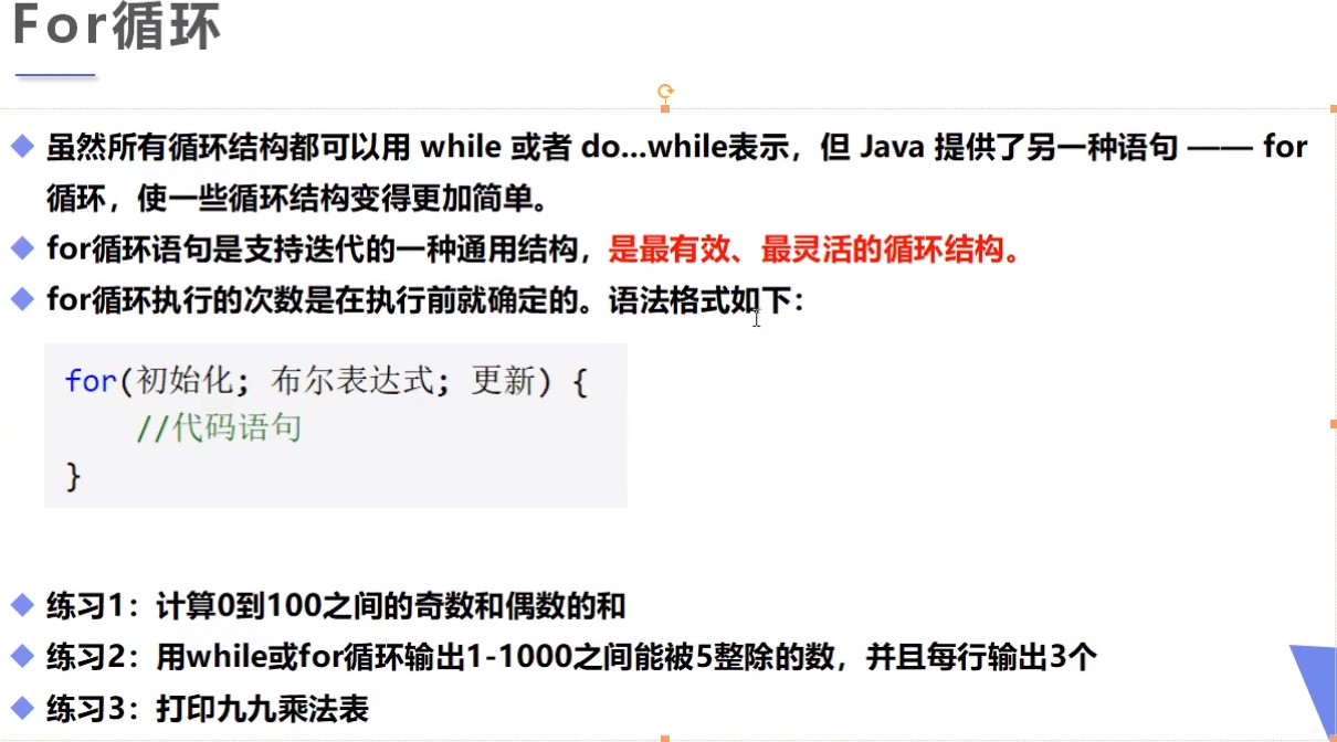格式:for(int i=1,i<100,i++),分别为初始值,布尔表达式,和迭代