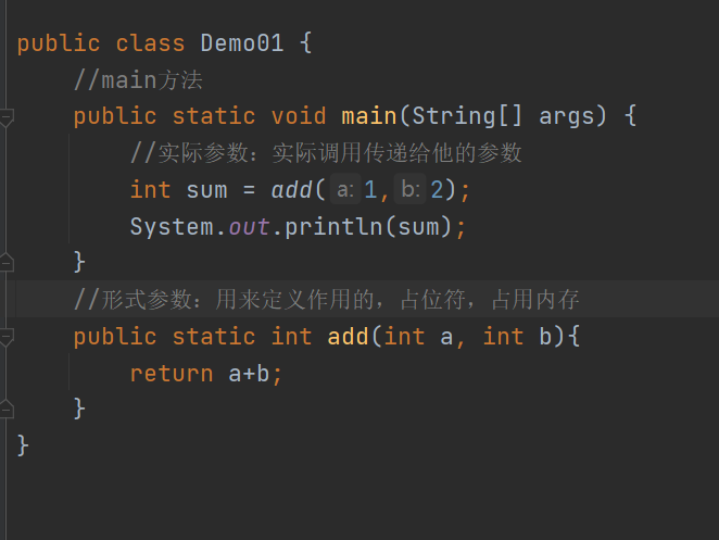 b.形式参数:没有实际赋值的参数,占位符为之后赋值的数占需要的内存