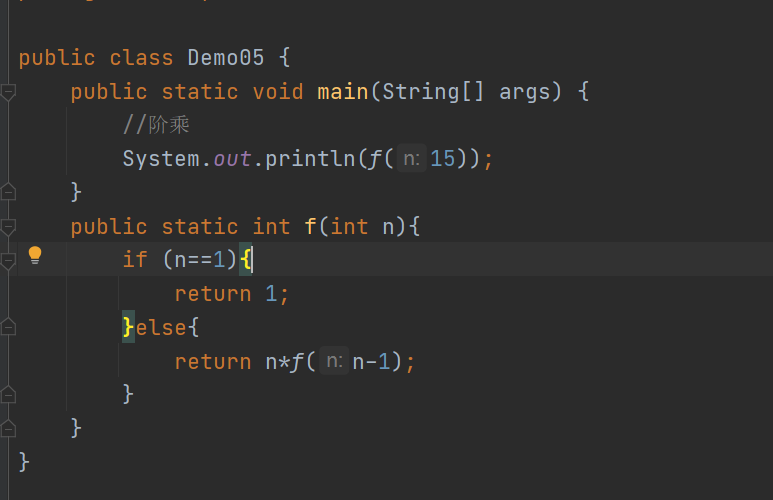 return n*f(n:n-1)中,f(n:n-1)是一个递归体,当n-1不等于1时,会一直进行n*f(n:n-1)的递归