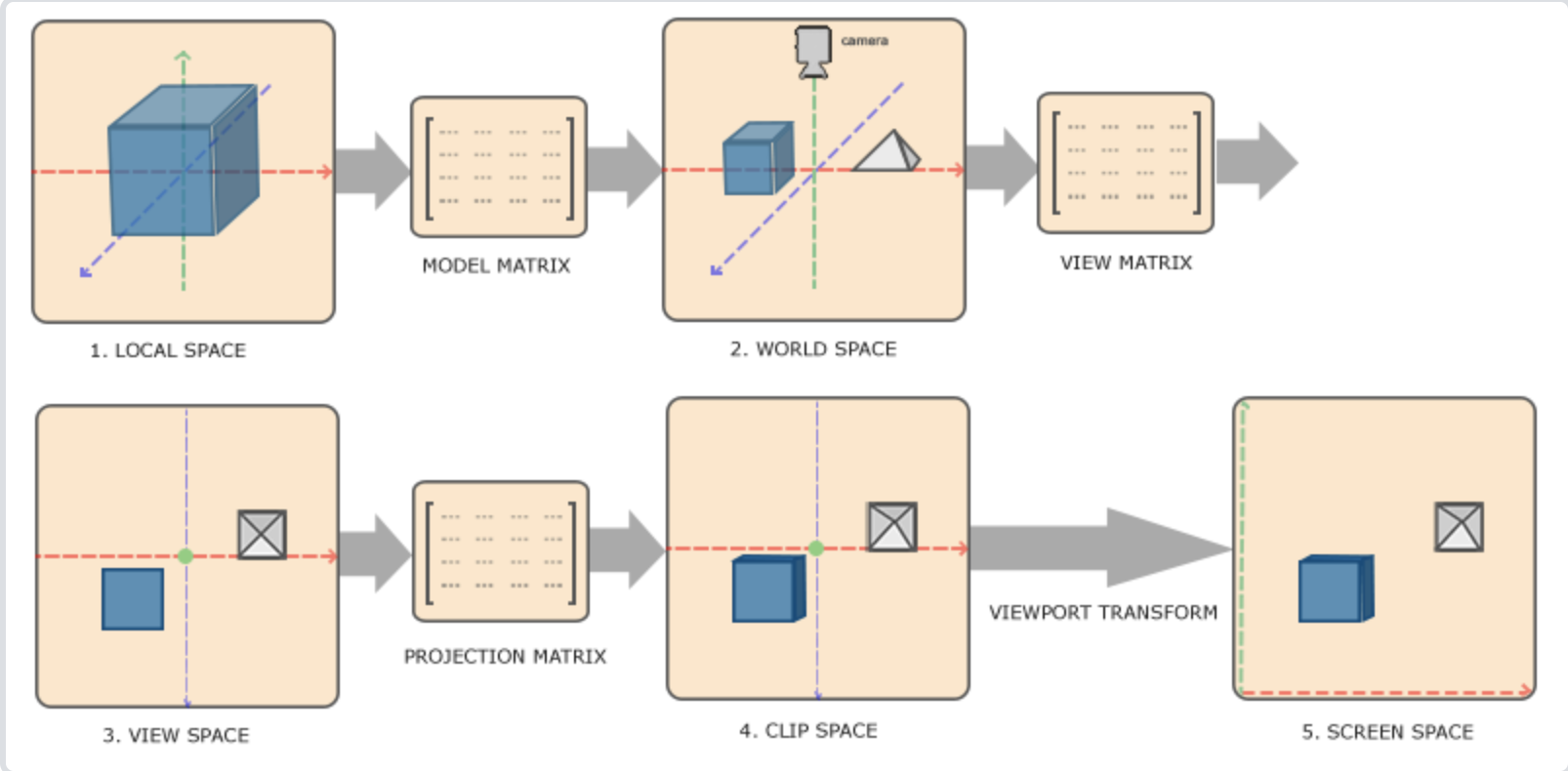 正常的坐标转换流程是:本地坐标通过模型矩阵转换成世界坐标、世界坐标通过观察空间矩阵转换成视图空间坐标、视图空间坐标通过裁切矩阵转换成裁切空间坐标,裁切空间坐标通过视口转换转换成屏幕坐标;