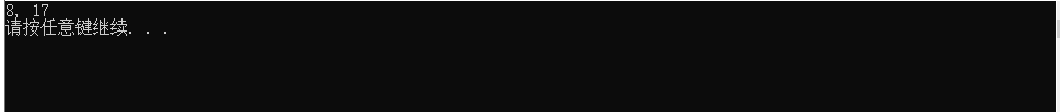 // 练习:局部static变量特性 #include <stdio.h> #include<stdlib.h> int func(int, int); // 函数声明 int main() { int k = 4, m = 1, p1, p2; p1 = func(k, m); // 函数调用 p2 = func(k, m); // 函数调用 printf("%d, %d\n", p1, p2); system("pause"); return 0; } // 函数定义 int func(int a, int b) { static int m = 0, i = 2; i += m + 1; m = i + a + b; return m; }
